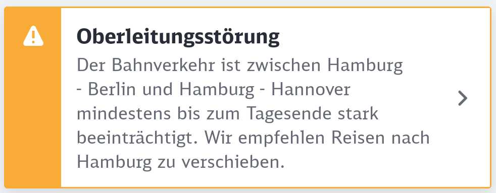 Wie, um dies zu unterstreichen, - Ironie des Schicksals - sorgte heute eine beschädigte Oberleitung in Uelzen für einen Zusammenbruch des Verkehrs in halb Norddeutschland, inklusive der Verbindung Hamburg - Berlin: Eigentlich fahren Züge zwischen Hamburg und Berlin nicht über Uelzen. "Dank" des Kompromisses, dass man Strecken für die Reparatur auch voll sperrt, aber eben doch. Redundante Strukturen: Fehlanzeige. Die Folge sind Großstörungen ungekannten Ausmaßes.